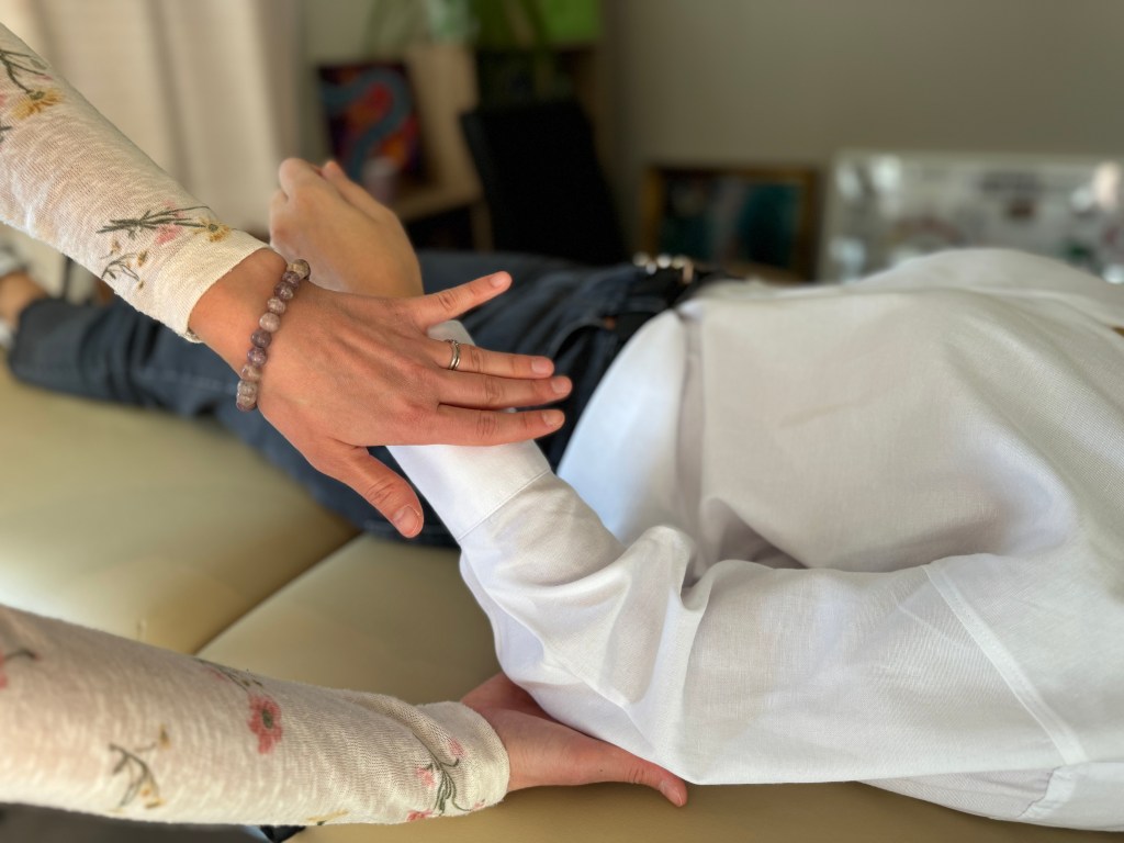 - Je teste un muscle de votre bras pour identifier et suivre la méthode la plus appropriée pour travailler votre problématique au moment présent.